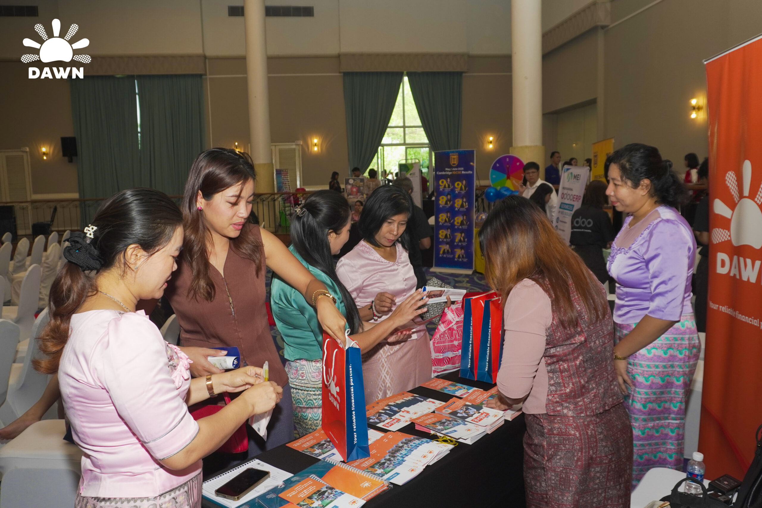 အဆိုပါအခမ်းအနားတွင် DAWN Team မှ တက်ရောက်လာသူများနှင့် ရင်းနှီးစွာတွေ့ဆုံမိတ်ဆက်ကာ DAWN Microfinance ၏ လုပ်ငန်းဆောင်ရွက်မှုများ၊ လုပ်ငန်းခွင်ယဉ်ကျေးမှုနှင့် အမျိုးသမီးများအတွက် ရရှိနိုင်သော အလုပ်အကိုင်အခွင့်အလမ်းများကို မျှဝေပေးခဲ့ပါသည်။