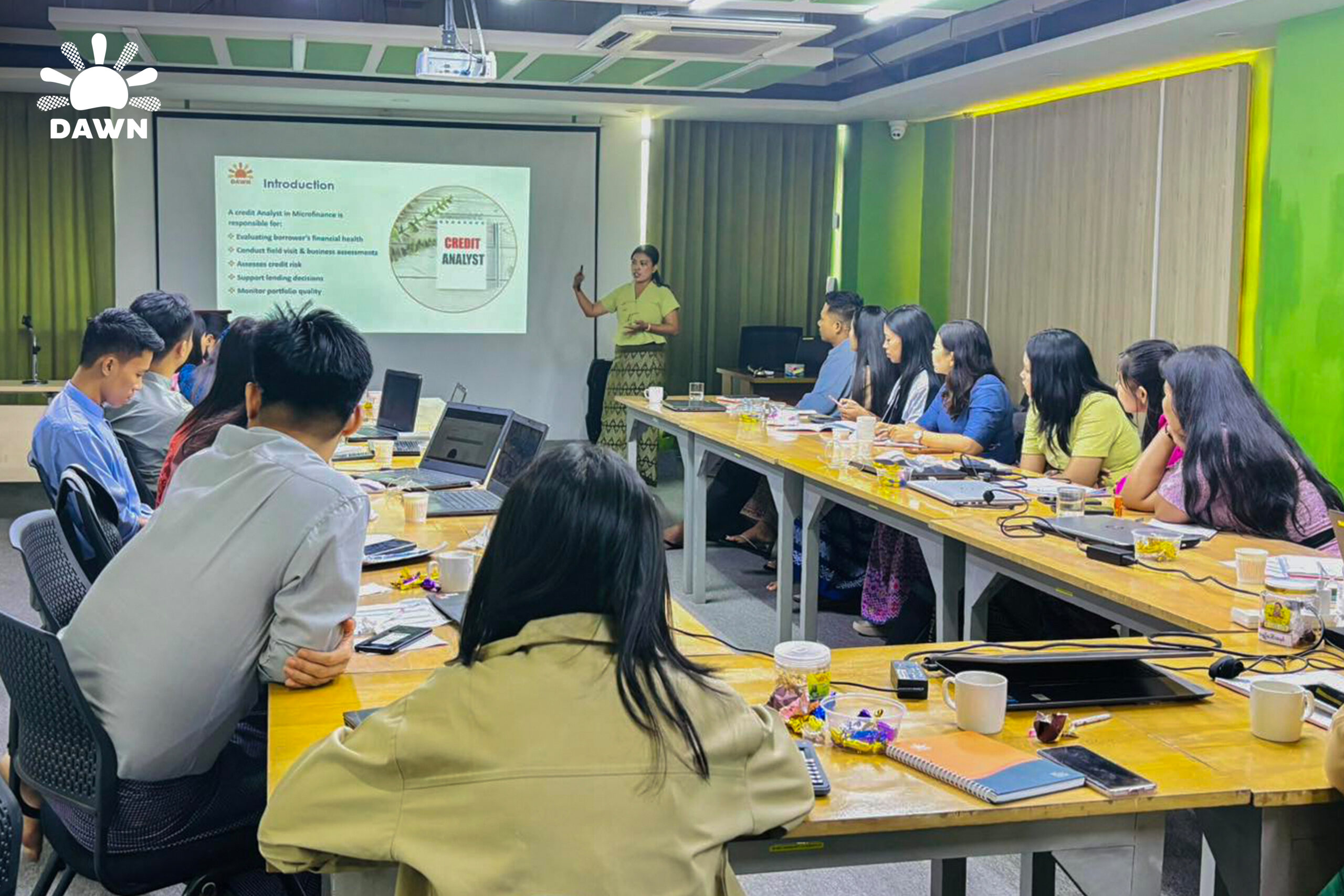 Workshop အတွင်းတွင် DAWN ၏ လုပ်ငန်းအခြေအနေများနှင့် ဈေးကွက်အခြေအနေများကို မျှဝေခြင်းအပြင် Income Statement နှင့် Balance Sheet များမှ သင်ယူနိုင်သော အချက်အလက်များ၊ MFI နှင့် Bank Loans ဆိုင်ရာ ခွဲခြမ်းစိတ်ဖြာမှုများကို လေ့လာဆွေးနွေးခဲ့ကြပါသည်။ ထို့အပြင် Credit Analyst များ၏ လုပ်ငန်းဆိုင်ရာ ကျွမ်းကျင်မှု မြှင့်တင်ရေးအတွက် Professionalism, Time Management, Emotional Intelligence နှင့် Effective Problem Solving စသည့် အရေးကြီးသော အကြောင်းအရာများကိုလည်း မျှဝေခဲ့ကြပါသည်။